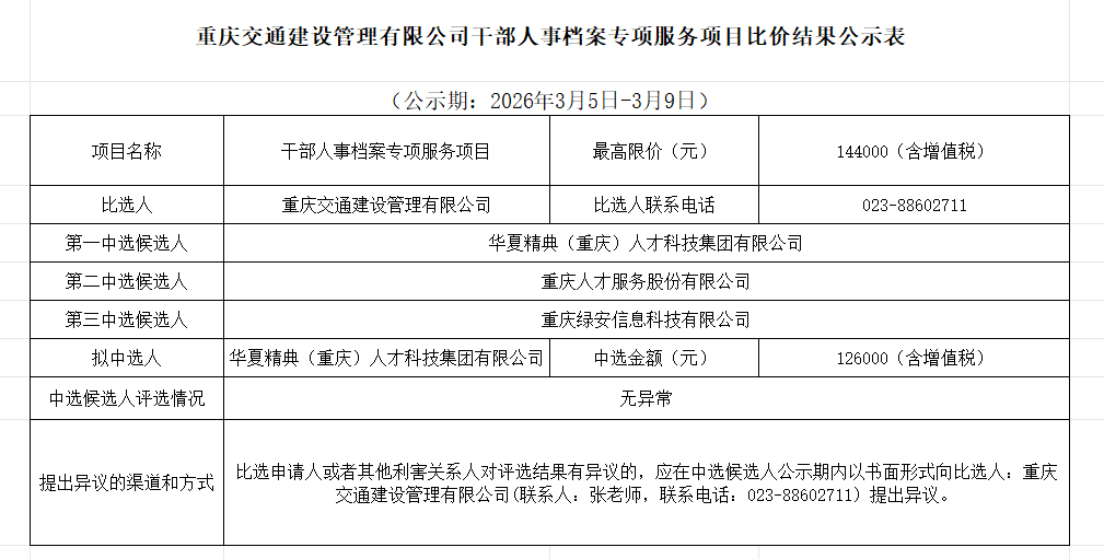 重庆交通建设管理有限公司干部人事档案专项服务项目比价结果公示表